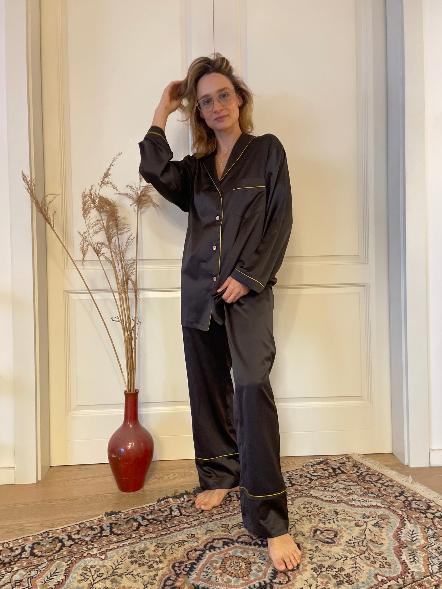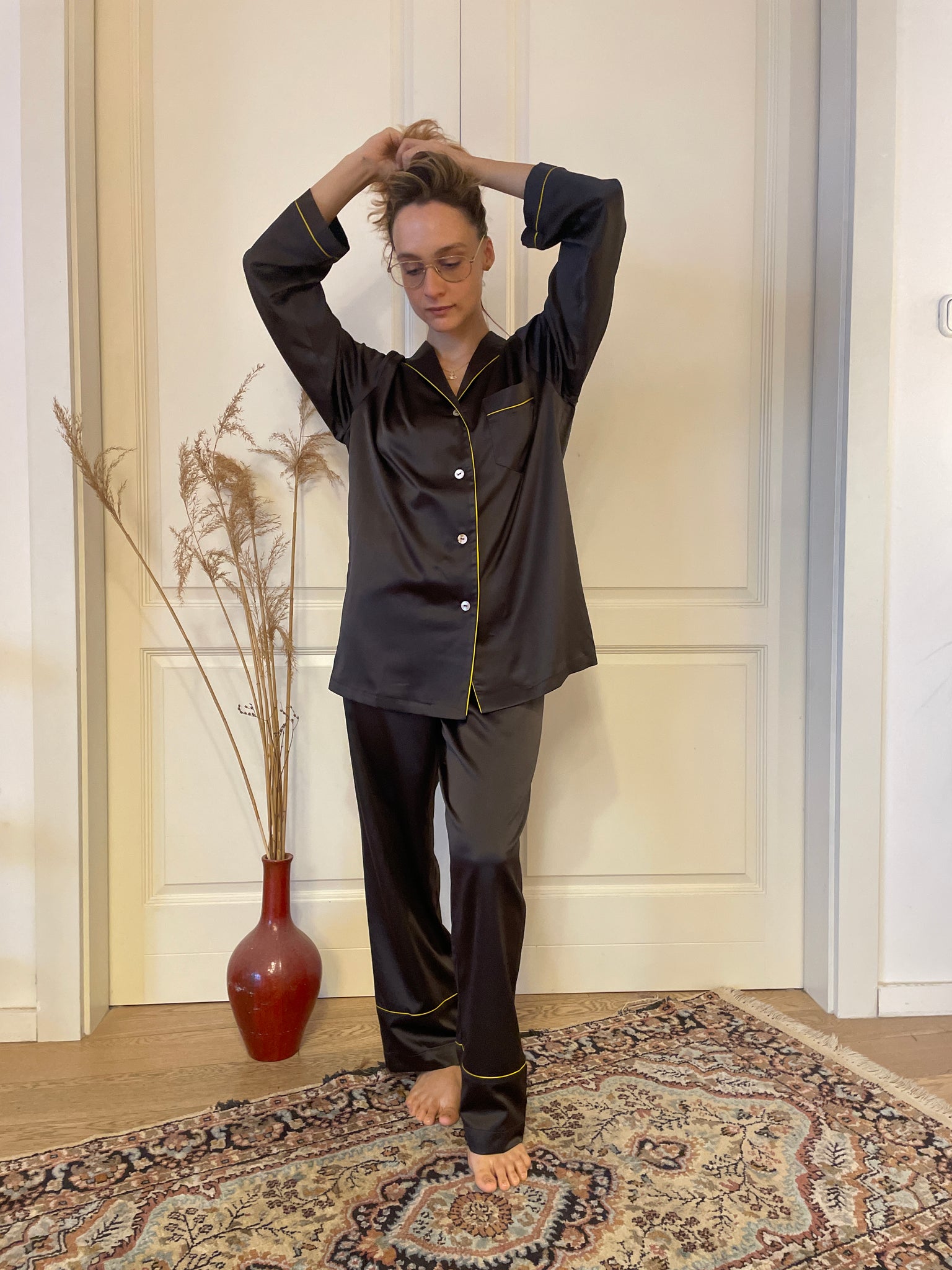 The relaxed silhouette is subtly defined by fine Olive Gold edging, adding warmth and depth to the rich Chocolate Brown tone. Elevated yet comforting, these pants move seamlessly between slow mornings, quiet afternoons, and softly lit nights.