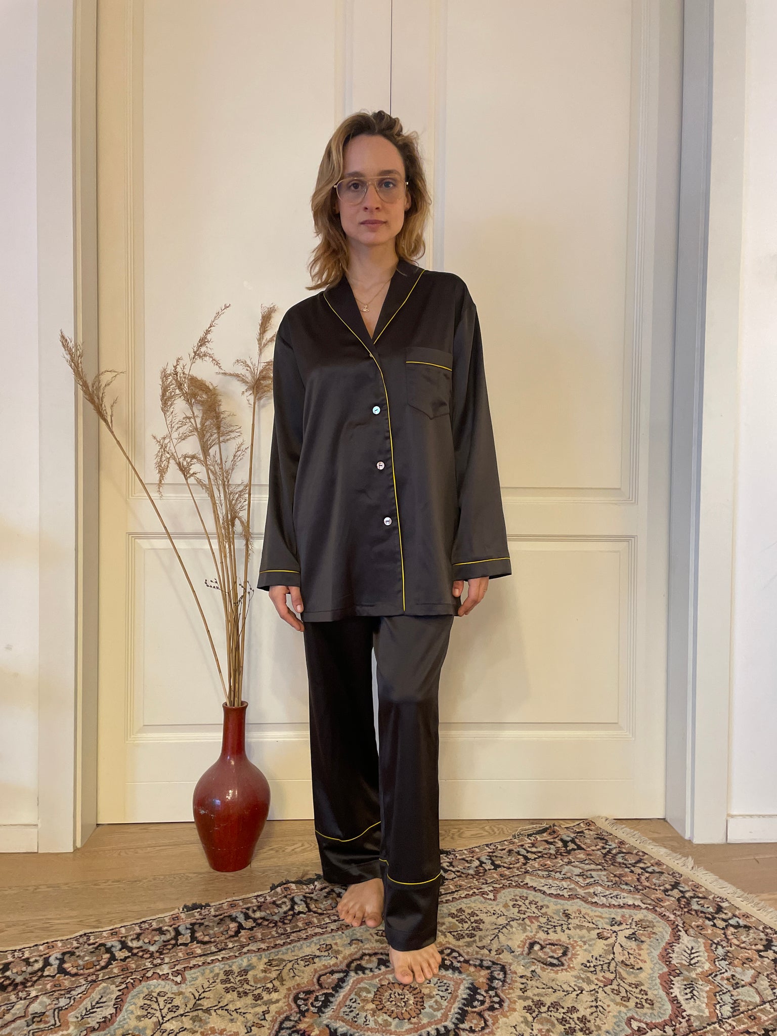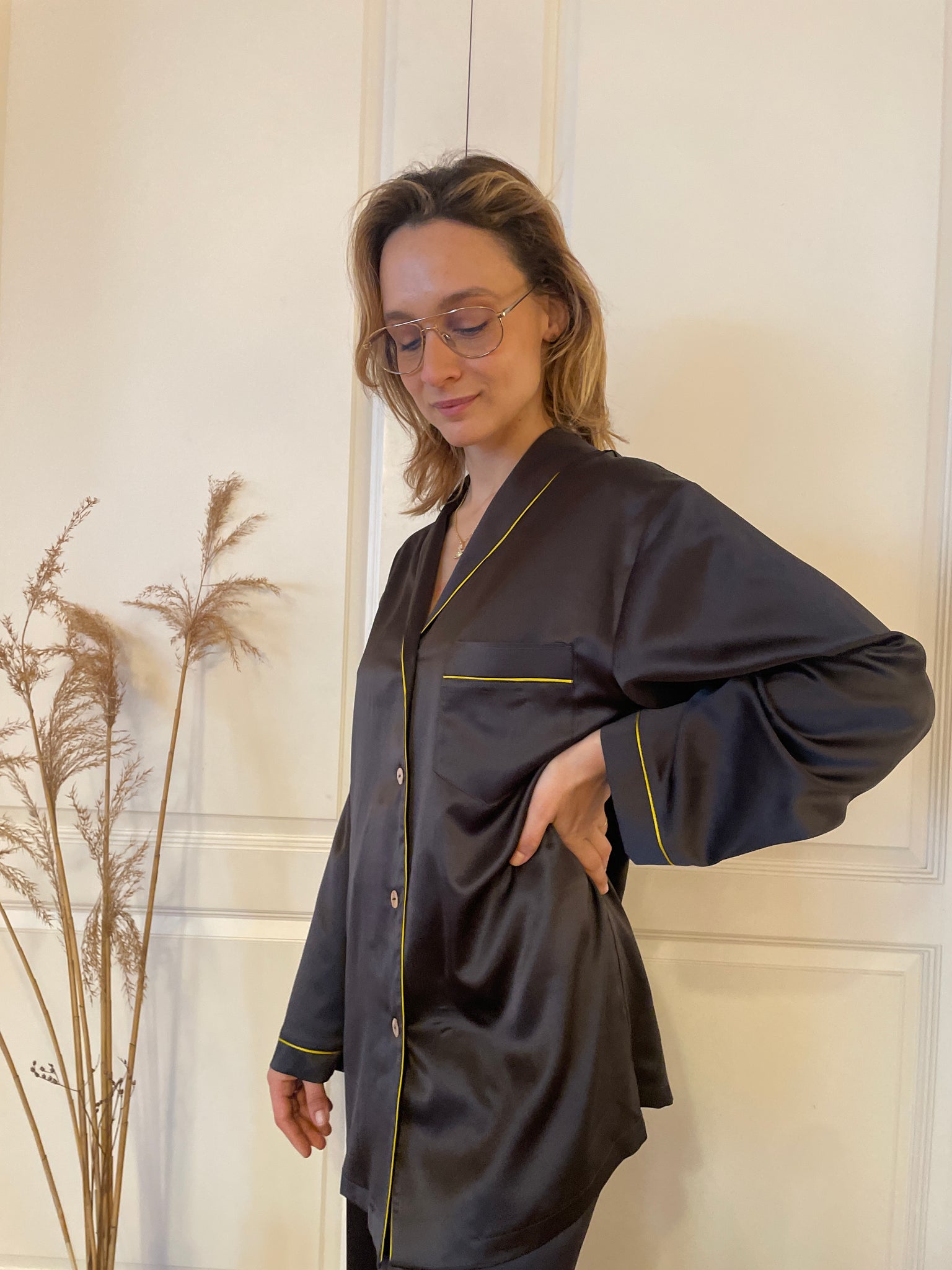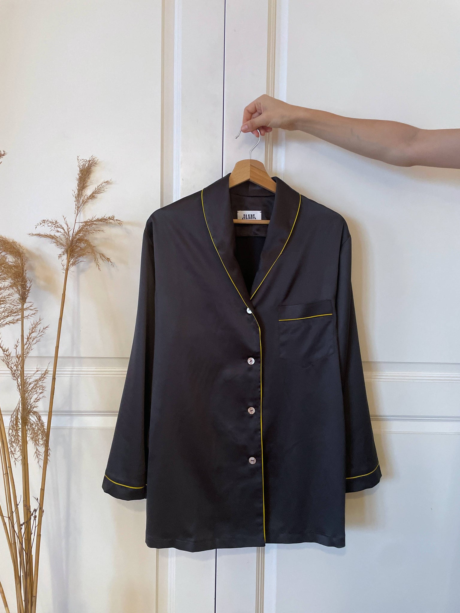 Cut from the same fluid satin fabric, it features fine Moss Green and Mustard edging that highlights the silhouette without overpowering it. Designed to be worn as a complete set or styled on its own, it embodies understated warmth and modern femininity.