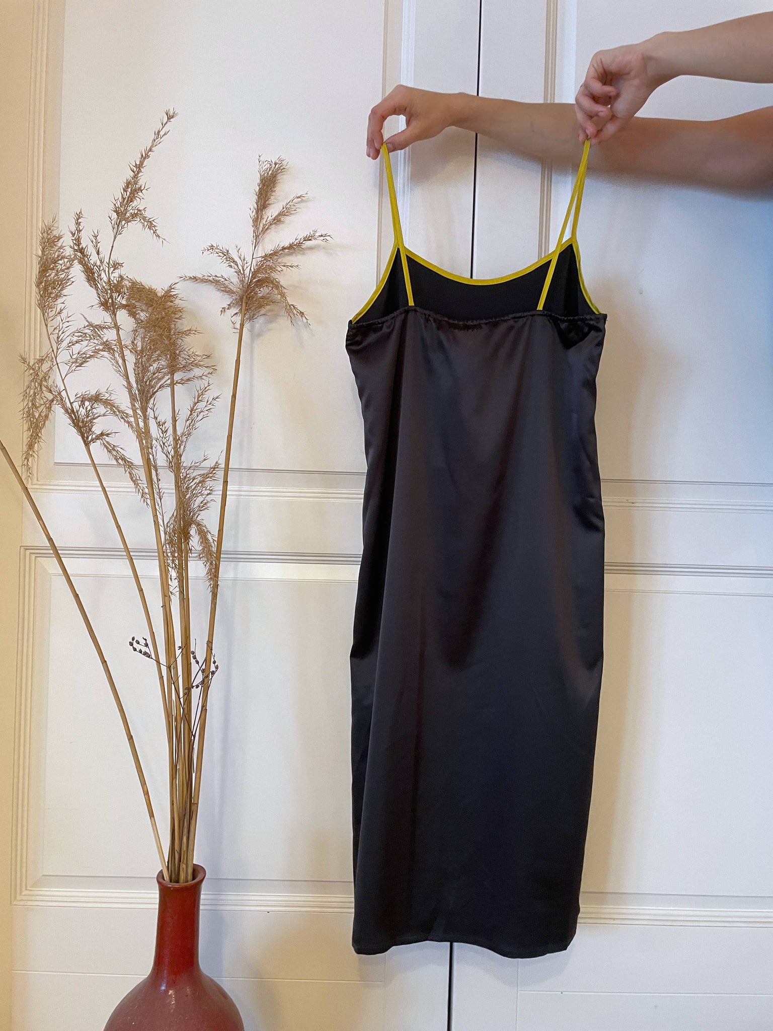 Its clean silhouette and delicate straps are softened by fluid satin fabric, while the Olive Gold edging adds a subtle, luminous contrast to the deep Chocolate Brown base. Designed for evenings that feel personal—whether worn out or kept intimate at home.