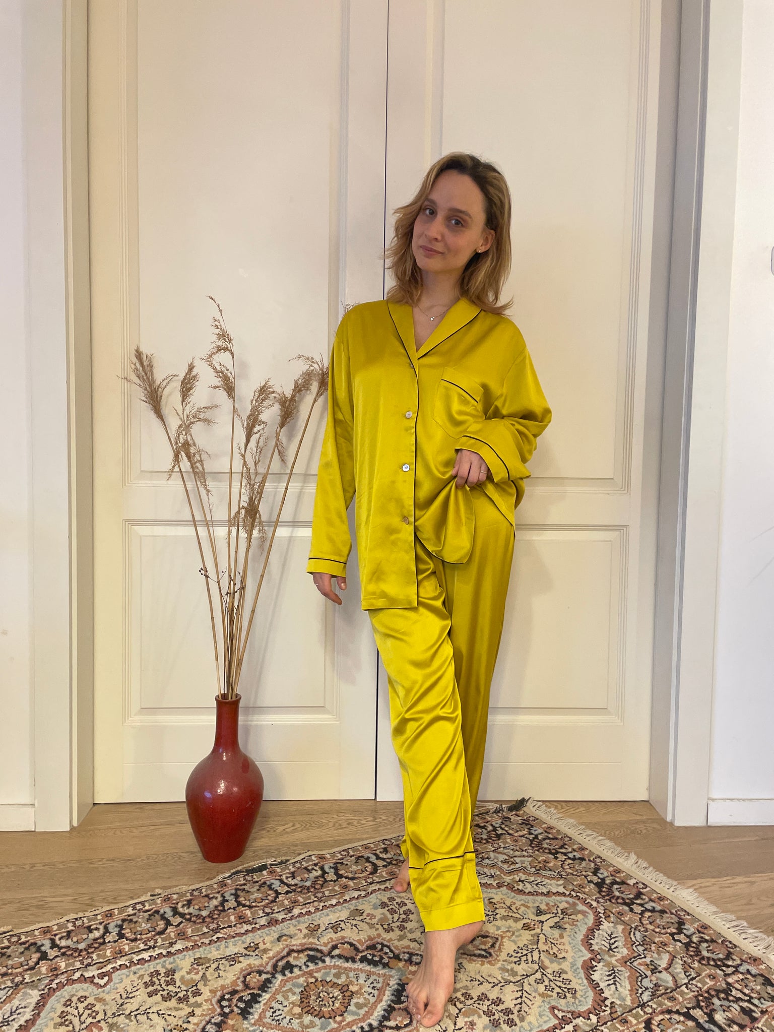The relaxed silhouette is subtly framed by fine Chocolate Brown edging, grounding the warm glow of the Olive Gold tone with depth and balance. Effortless yet elevated, these pants move seamlessly between slow mornings and intimate nights.