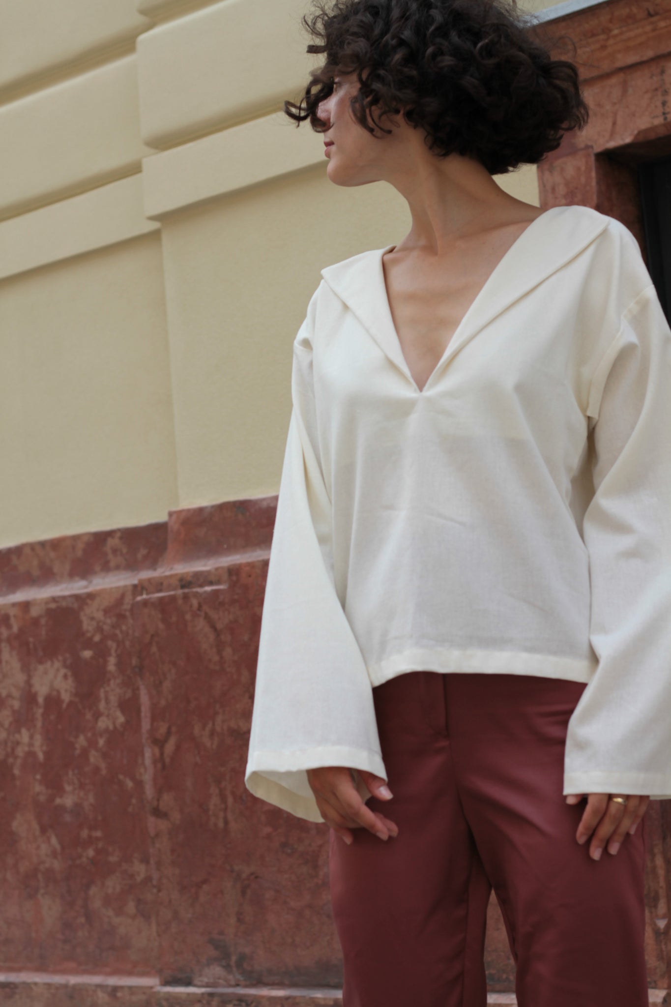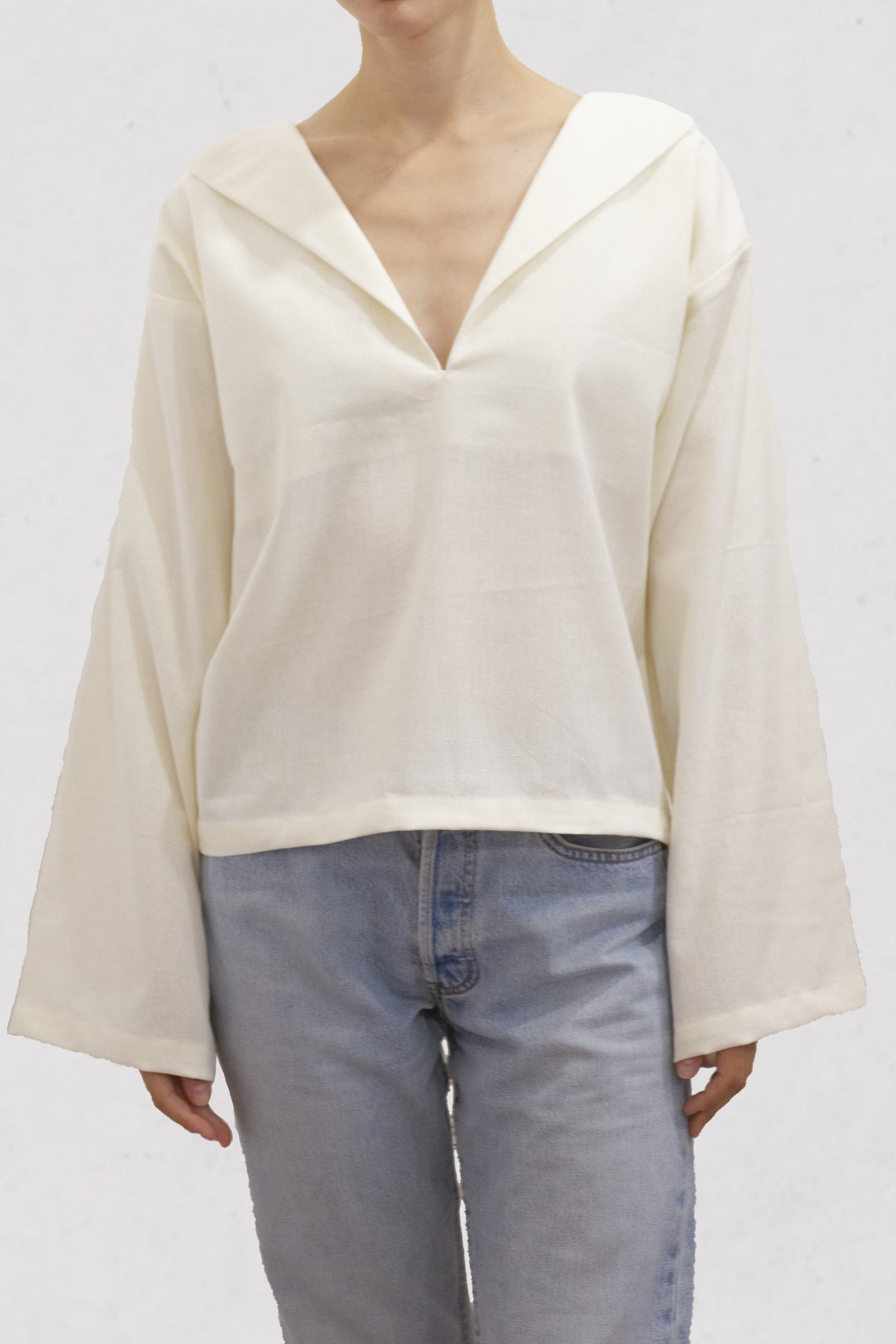 Loose-fitting boxy V-neck blouse with oversized lapels and wide sleeves.